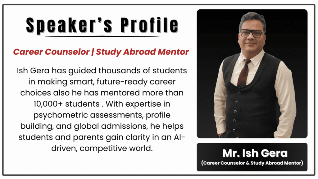 Ish Gera has guided thousands of students in making smart, future-ready career choices also he has mentored more than 10,000+ students . With expertise in psychometric assessments, profile building, and global admissions, he helps students and parents gain clarity in an AI-driven, competitive world.